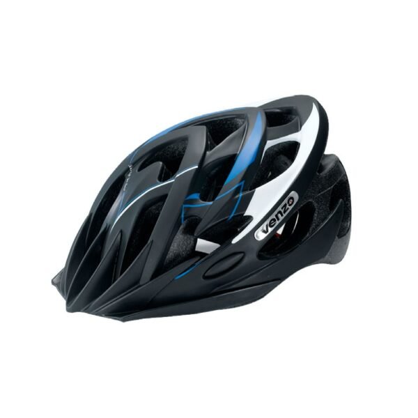 Casco de MTB Venzo. Color Negro/Azul/Blanco Talla M. 21 Ventilaciones. Construido en Tight-Fit Glue. Peso 250 gr. Incluye Visera.