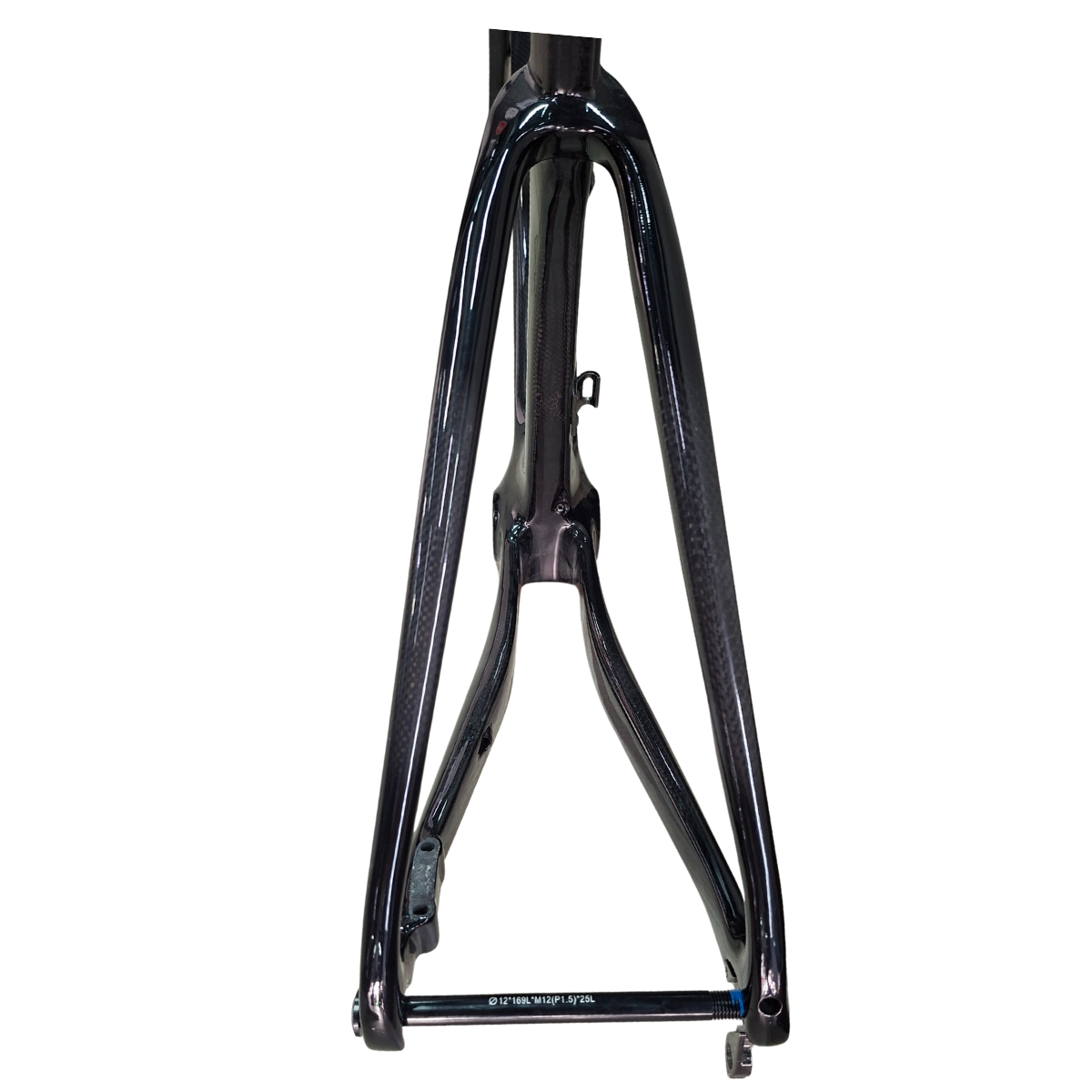 Material: Fibra de carbono de alto módulo (Cuadro + Horquilla + Tija de sillín + Manillar, 3K) Dimensiones del conjunto: 700C, BB T47 roscado + Tubo de dirección 52×52, Suspensión fijada al cuadro delantero, Tija de freno de disco Flat Mount, Eje pasante F12x100-R12x142, Neumático máx. 700x30C
